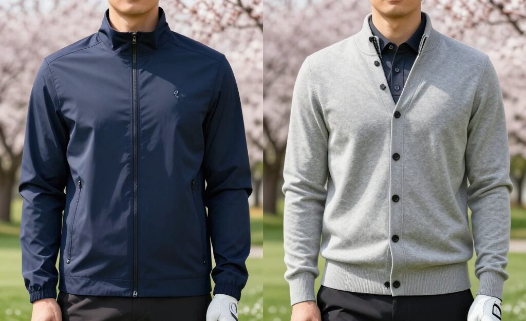 春ゴルフは気温変化が激しいため、薄手アウター選びが快適さを大きく左右します。